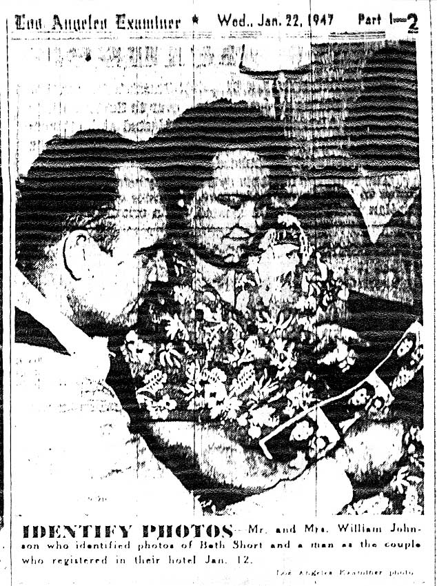 On Jan. 21, 1947, the Los Angeles Examiner photographed Mr. and Mrs. William Johnson, above, identifying a photo of Elizabeth Short and an unidentified man as a couple that rented a room at their motel. "Black Dahlia Avenger" says that they identified the man as Dr. George Hodel, shown at left. But take a close look at the pictures they are examining. It's clearly this photo, close-up at right, taken from a familiar series found in Elizabeth Short's photo album. Does he even vaguely resemble Dr. George Hodel?